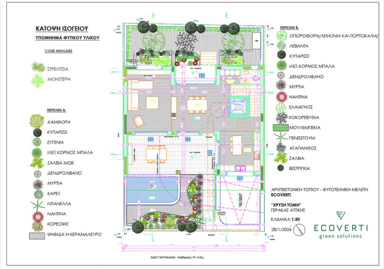 In the pool area, we designed a flower bed with a special and intense curve for our planting and delimited it with a decorative mosaic. In the raised flower beds, we proposed planting with creeping plants, in combination with plants that have a geometric crown, mainly spherical.