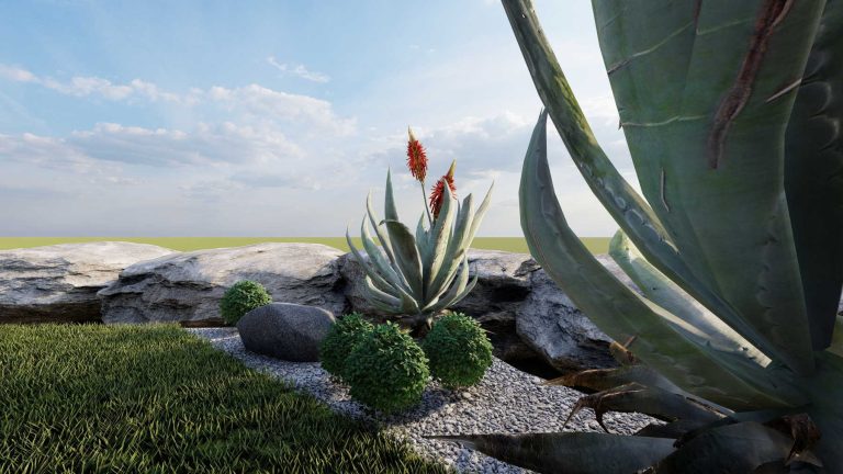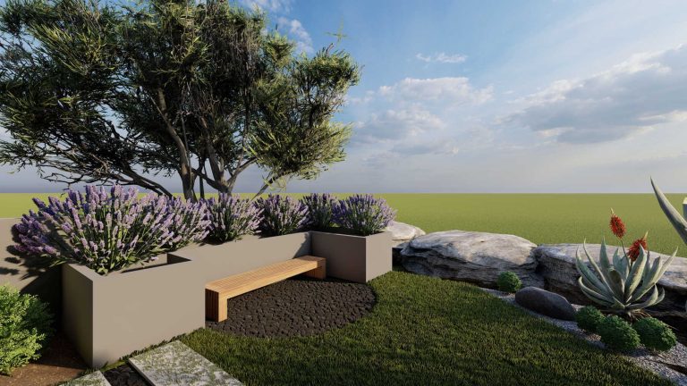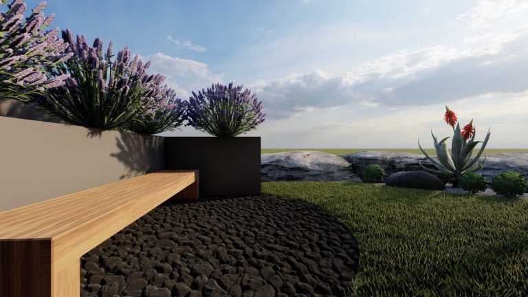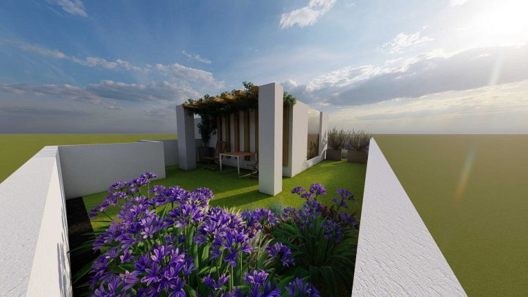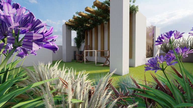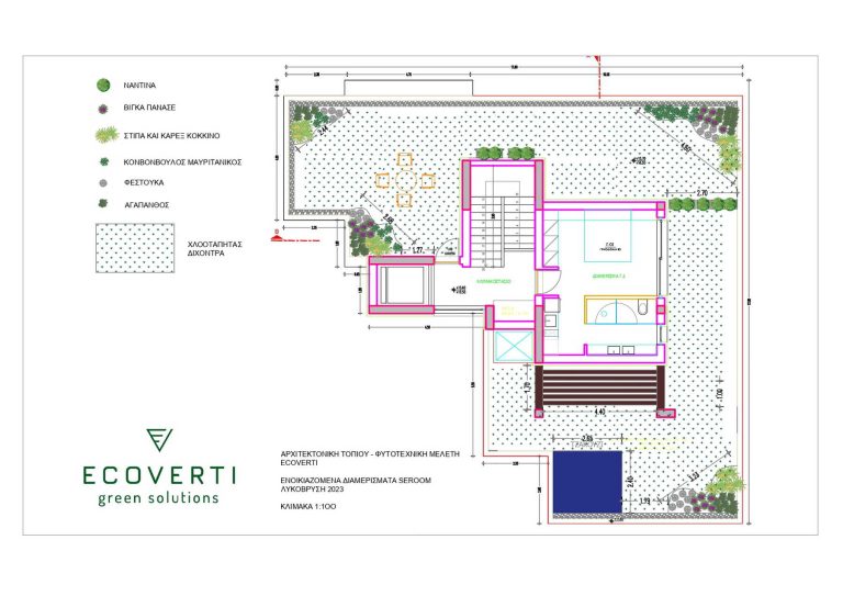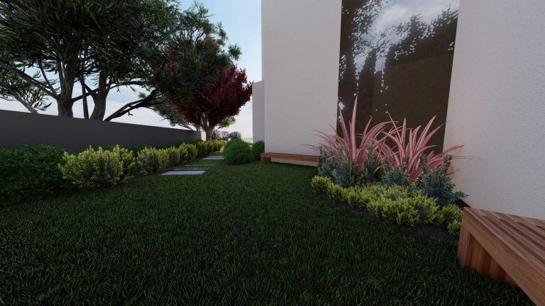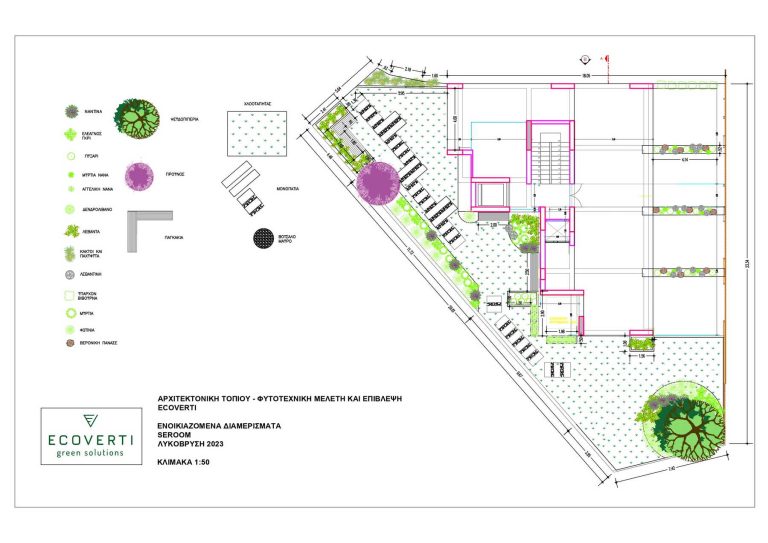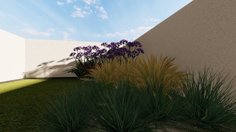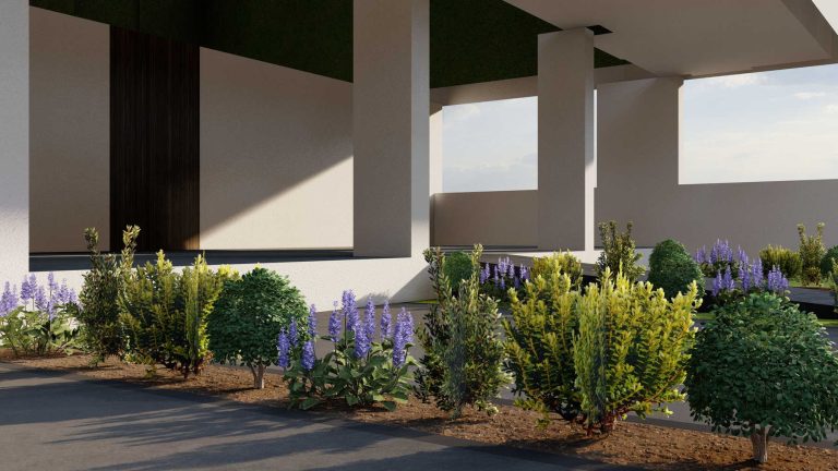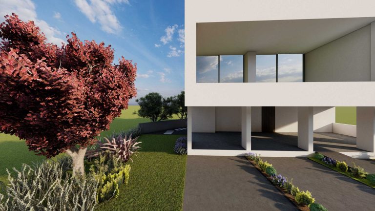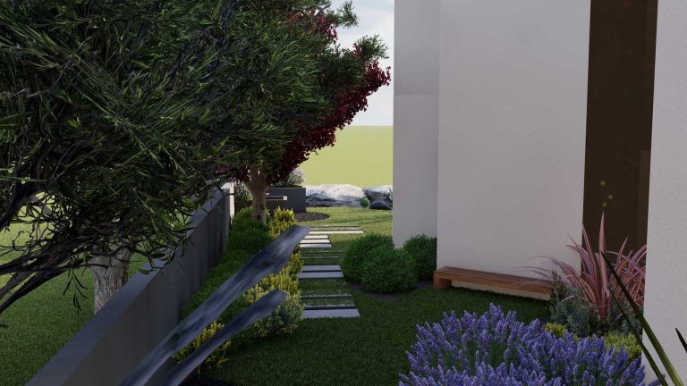 Our proposal for the surrounding ground floor space was to highlight it with a path flow, which would connect two outdoor living ”rooms”. With this design, we wanted to achieve a perspective and interesting flow, as we walk along the path. The choice of plant material was made based on the climatic conditions of the area and the planting palette with plants that have textures and colors in shades of purple, gray and green, with red touches.